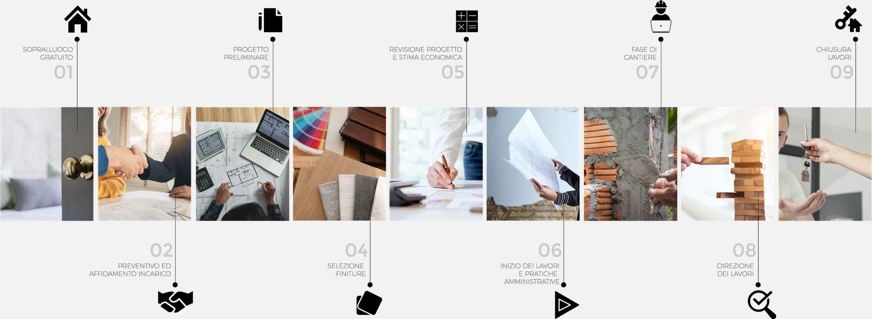 La gestione del progetto in ogni sua parte, evitando lo stress delle pratiche burocratiche e procedure legali, accompagnando la scelta dei materiali, arredi, rivestimenti, ecc... ed un lavoro di cantiere effettuato da maestranze specializzate monitorato attraverso la direzione lavori garantisce qualità ed affidabilità.